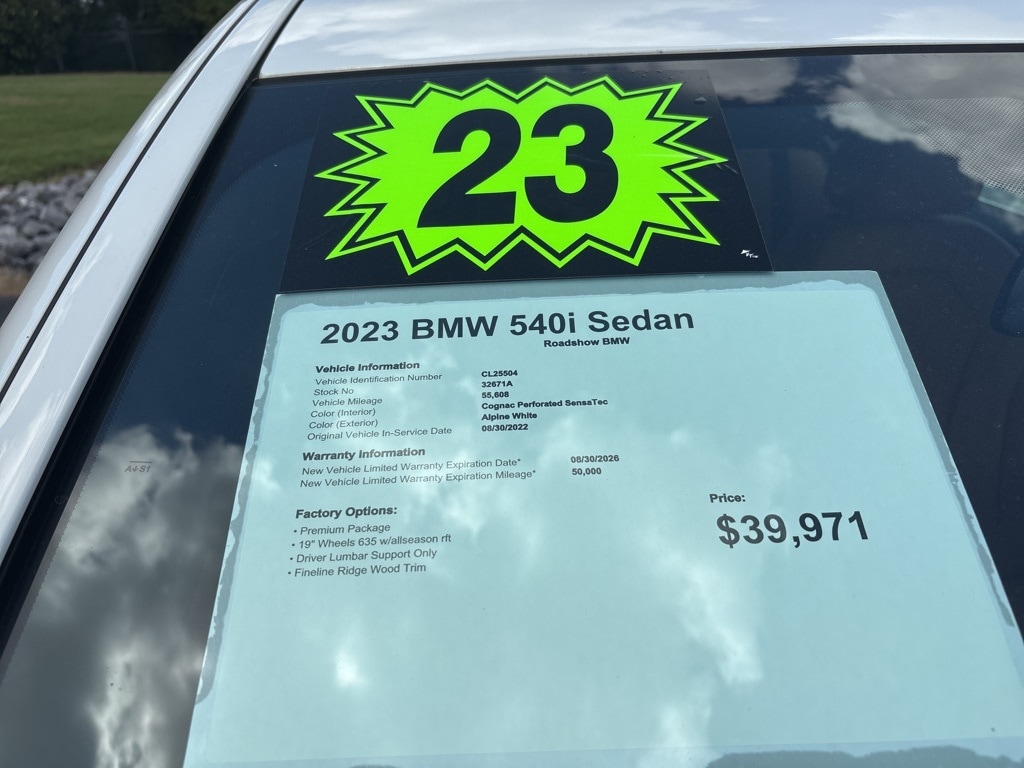 CARFAX One-Owner. Clean CARFAX. Alpine White 2023 BMW 5 Series 540i RWD 8-Speed Automatic Sport 3.0L I6 Turbocharged DOHC 24V LEV3-ULEV70 ** NAVIGATION SYSTEM **, ** ALUMINUM WHEELS **, ** AMBIENT LIGHT PACKAGE **, ** BACKUP CAMERA **, ** BLUETOOTH **, ** CONVENIENCE LIGHT PACKAGE **, ** CONVENIENCE PACKAGE **, ** MOONROOF **, ** MULTIMEDIA PACKAGE **, ** REMOTE START **, ** SUNROOF/MOONROOF **, Cognac Artificial Leather, 12 Speakers, ABS brakes, Air Conditioning, Auto High-beam Headlights, Auto tilt-away steering wheel, Auto-dimming door mirrors, Auto-dimming Rear-View mirror, Automatic temperature control, BMW Assist eCall, BMW TeleServices, Brake assist, Bumpers: body-color, Connected Package Pro, ConnectedDrive Services, Delay-off headlights, Driver door bin, Driver Lumbar Support Only (DISC), Driver vanity mirror, Dual front impact airbags, Dual front side impact airbags, Electronic Stability Control, Enhanced USB & Bluetooth w/Smartphone Integration, Exterior Parking Camera Rear, Four wheel independent suspension, Front anti-roll bar, Front Bucket Seats, Front Center Armrest, Front dual zone A/C, Front reading lights, Fully automatic headlights, Garage door transmitter, Genuine wood console insert, Genuine wood dashboard insert, Genuine wood door panel insert, harman/kardon Surround Sound System, Head-Up Display, Heated door mirrors, Heated Front Seats, Illuminated entry, Leather Shift Knob, Leather steering wheel, Live Cockpit Pro w/Navi, Low tire pressure warning, Memory seat, Navigation System, Occupant sensing airbag, Outside temperature display, Overhead airbag, Panic alarm, Passenger vanity mirror, Perforated SensaTec Upholstery, Power door mirrors, Power driver seat, Power moonroof, Power passenger seat, Power steering, Power Tailgate, Power windows, Premium Package, Rain sensing wipers, Rear anti-roll bar, Rear reading lights, Rear seat center armrest, Rear window defroster, Remote Engine Start, Remote keyless entry, Security system, Speed control, Speed-sensing steering, Speed-Sensitive Wipers, Split folding rear seat, Sport steering wheel, Steering wheel memory, Steering wheel mounted audio controls, Tachometer, Telescoping steering wheel, Tilt steering wheel, Traction control, Trip computer, Turn signal indicator mirrors, Variably intermittent wipers, Wheels: 19" x 8" V-Spoke Burnished Orbit Grey.